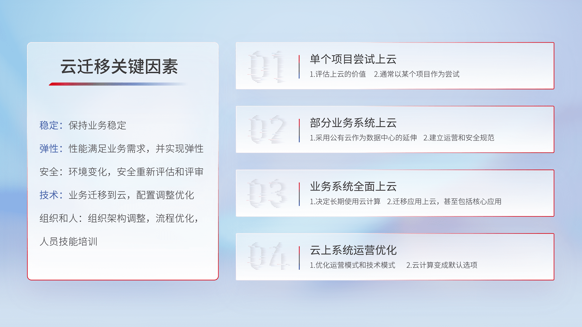结合实际业务,,从规划设计、、、、云平台选型、、、云原生改造、、、、数据迁移、、集成交付,,,迁移全过程为客户识别最佳上云路径,,,做好风险识别管理,,设计网络架构、、、、身份权限、、、、安全审计合规、、、、操作审计、、日志审计、、监控告警策略、、、、多站点容灾设计等,,,,对云上基础设施进行整体规划,,提升IT治理水平,,,以满足弹性、、高可用、、、高性能的需求。。。