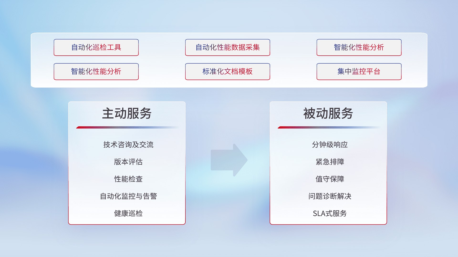 智能化工具和标准化文档,,,,保障服务质量,,提供主动服务(包含技术咨询、、、版本评估、、性能检查、、、、自动化监控与告警、、、健康巡检)和被动服务包含(分钟级响应、、、、紧急排障、、、值守保障、、、、问题诊断解决、、SLA服务)。。。。